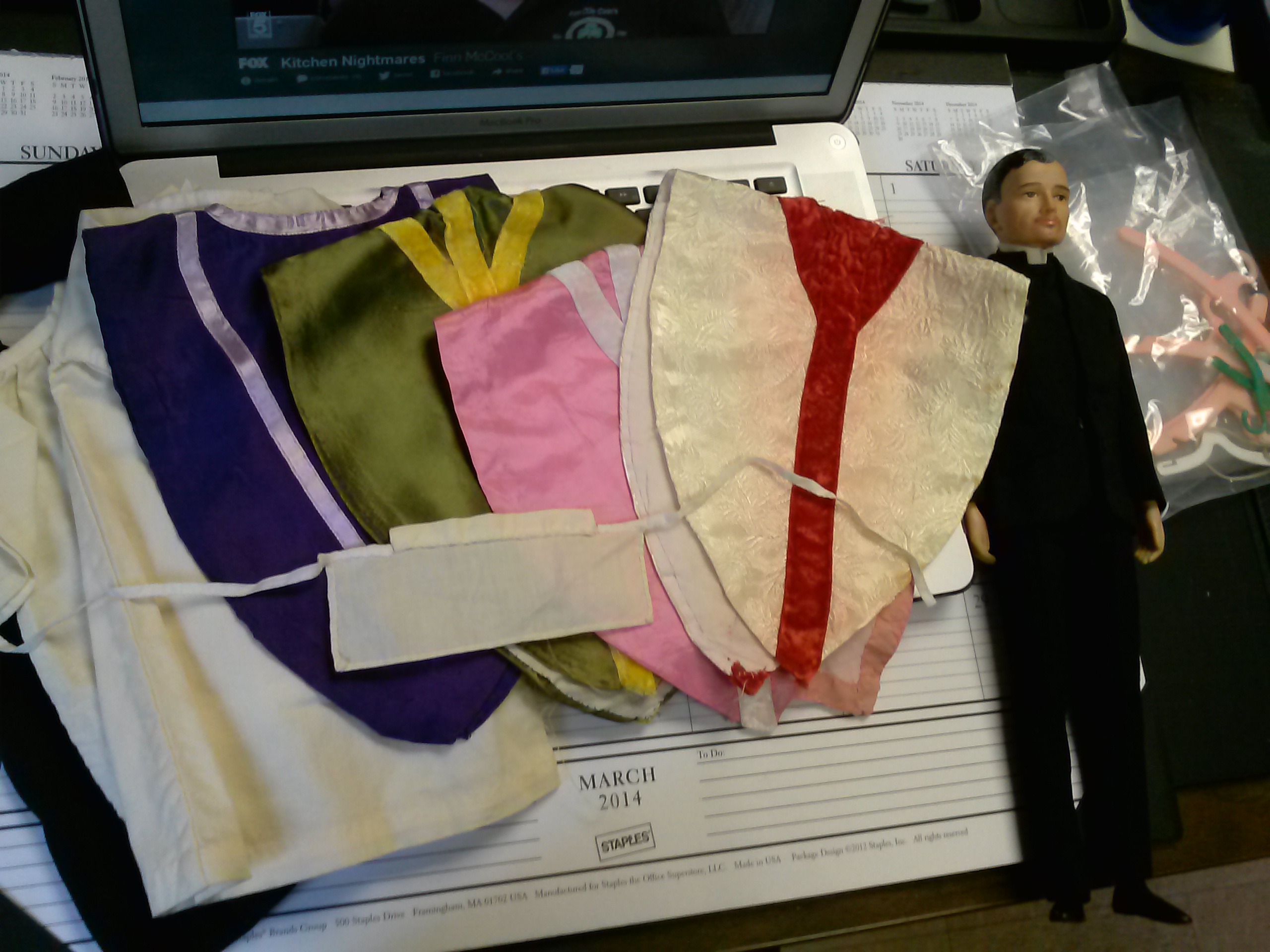 We had a Christmas fair at Emmanuel Church in Great River, NY where I serve as priest in charge. I was out of town during the fair, but when I got back, all the unsold items were in boxes around the parish hall. Of course, I decided to see if anything good was lying around and what to my wandering eyes did appear? A priest “Barbie” doll complete with vestments in a plastic bag (with hangers).