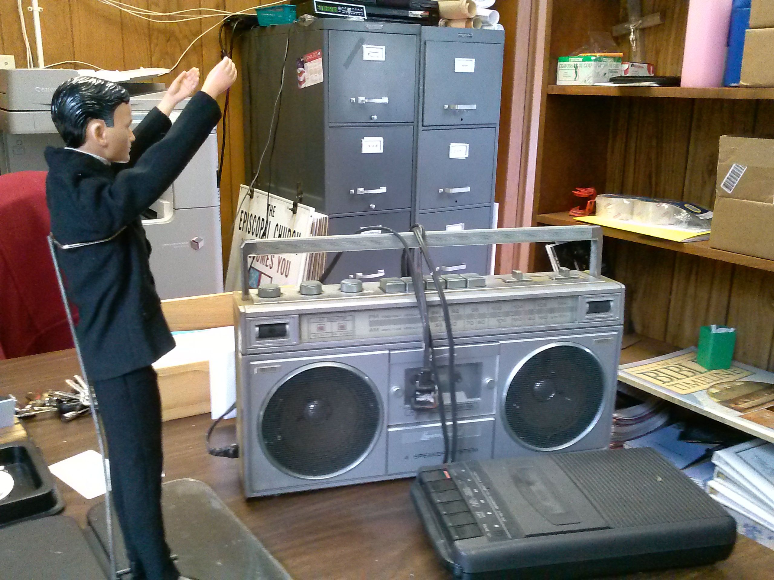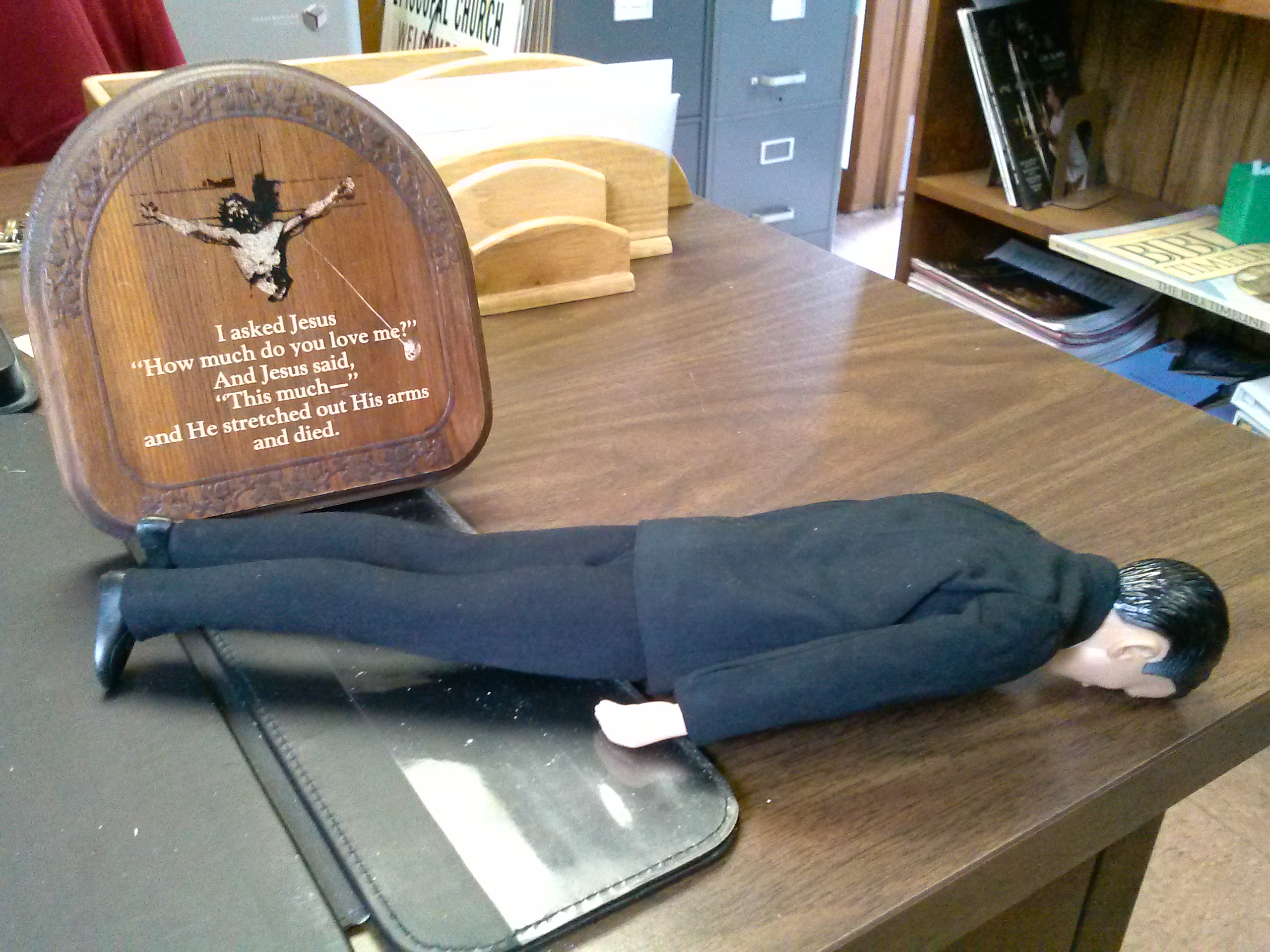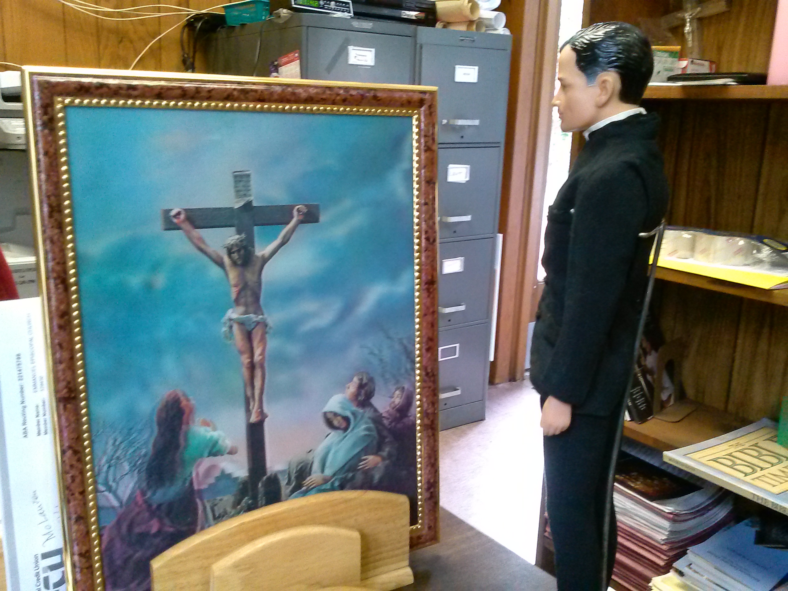 You can’t see it, but Fr. Kenny is shaking his head. I can only say, at least this isn’t hanging up. The mourners move as you turn the picture side to side and of course Jesus is super caucasian, which is not accurate at all. But it is good for a laugh. There is a market out there for terrible religious kitsch, some people collect the stuff.