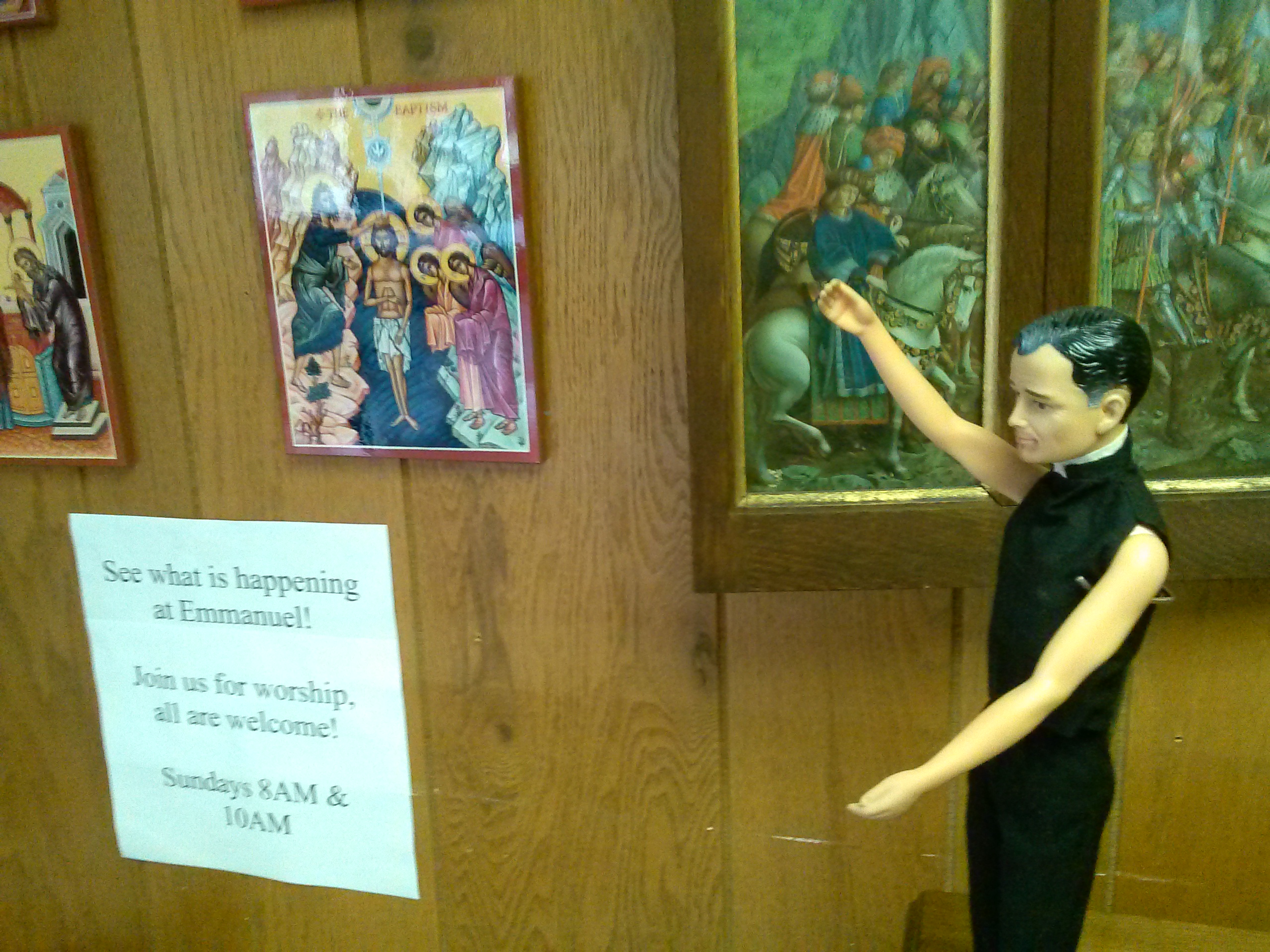 I met my predecessor, Fr. Domenic, once. He showed me these lovely icons and said he always had wanted to hang them up, but never got around to it. There is no better time than now, right? I love these, they are Orthodox icons, which means they are more of a Middle Eastern style, very similar to some I saw while I was in Turkey last year. Orthodox icons always appeal to me, I’m not really sure why, but I find them lovely. Emmanuel has a beautiful replica of the Ghent altarpiece (click here to read about that), so I thought it would be great to put them around it.