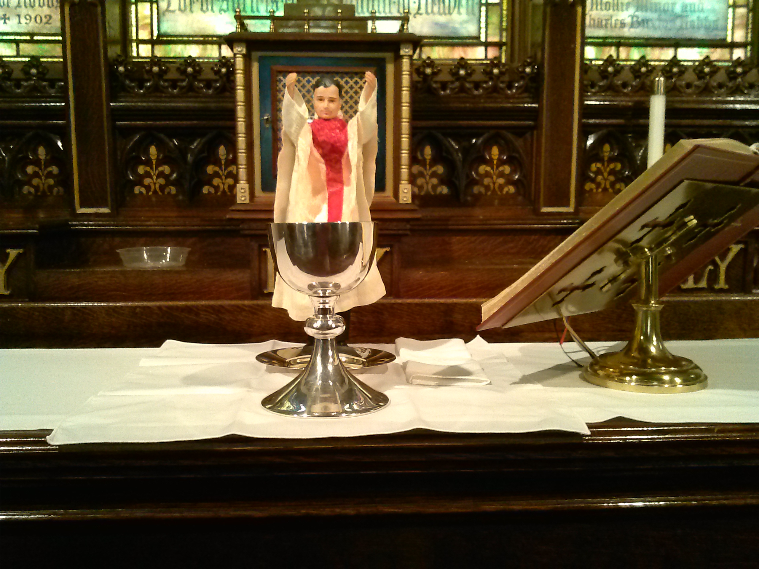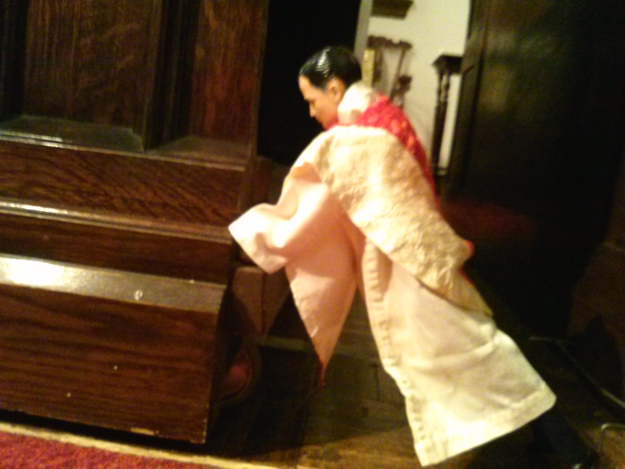 We’re back with some fun pictures and a little instruction. It is Eastertide, so Fr. Kenny is wearing his white chasuble for the occasion. It is a bit stained and old, but it functions.