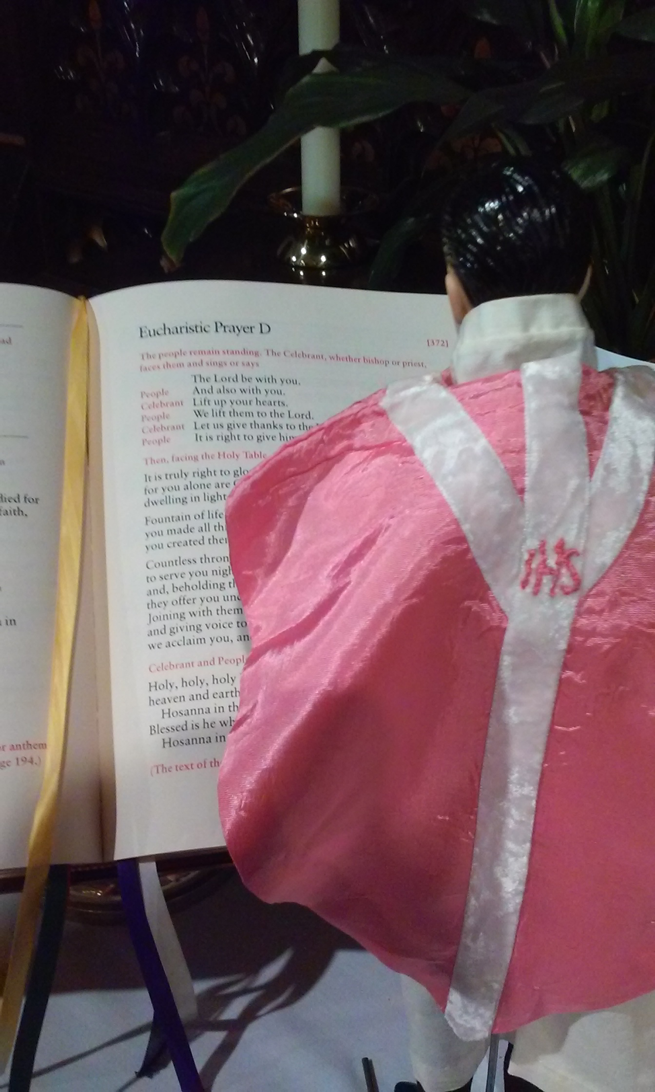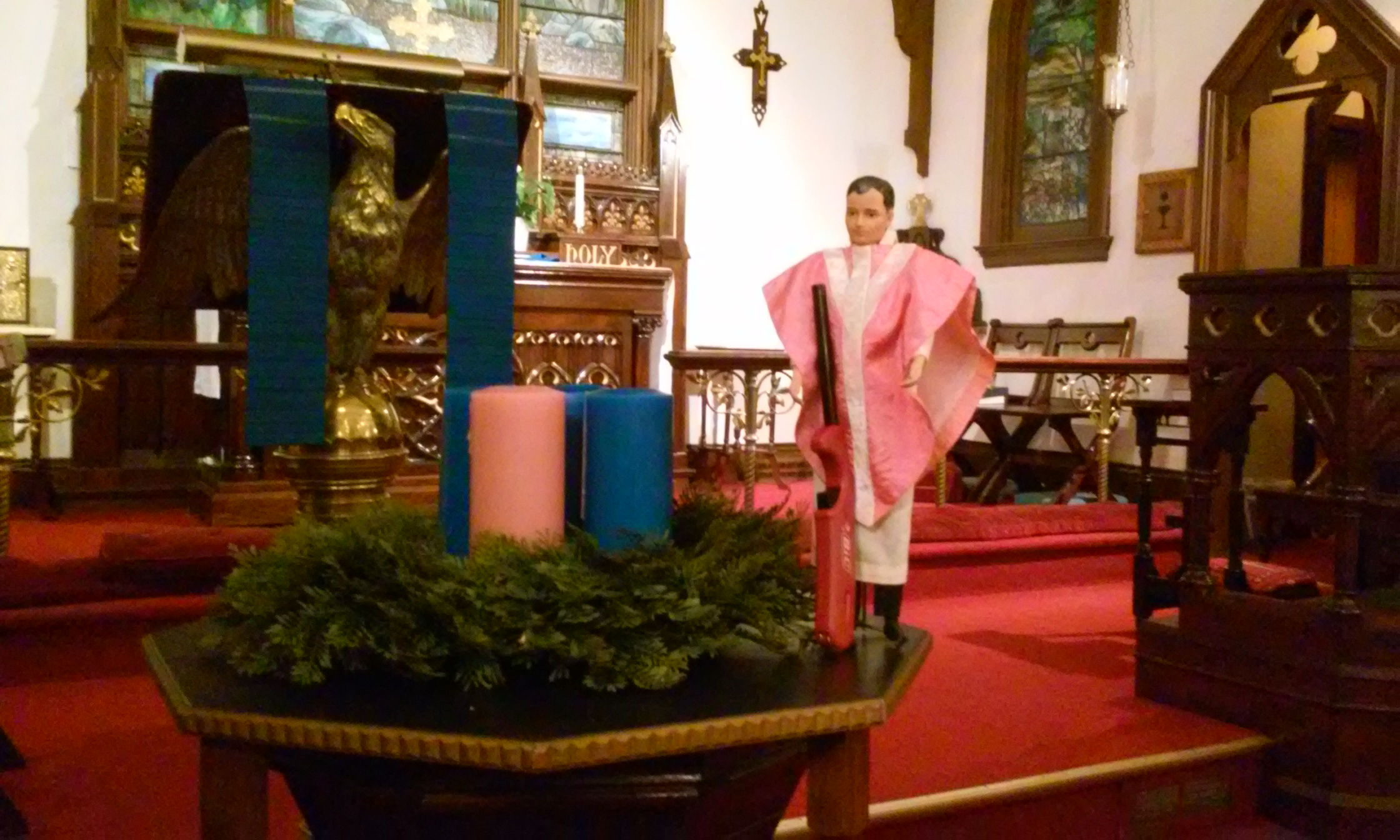 This past Sunday (the 14th) was the 3rd Sunday of Advent, the week when we light the pink candle on the wreath. I was away, so Fr. Kenny held down the fort, and got to break out his rose colored vestments, or as I like to call it the pretty pink chasuble.