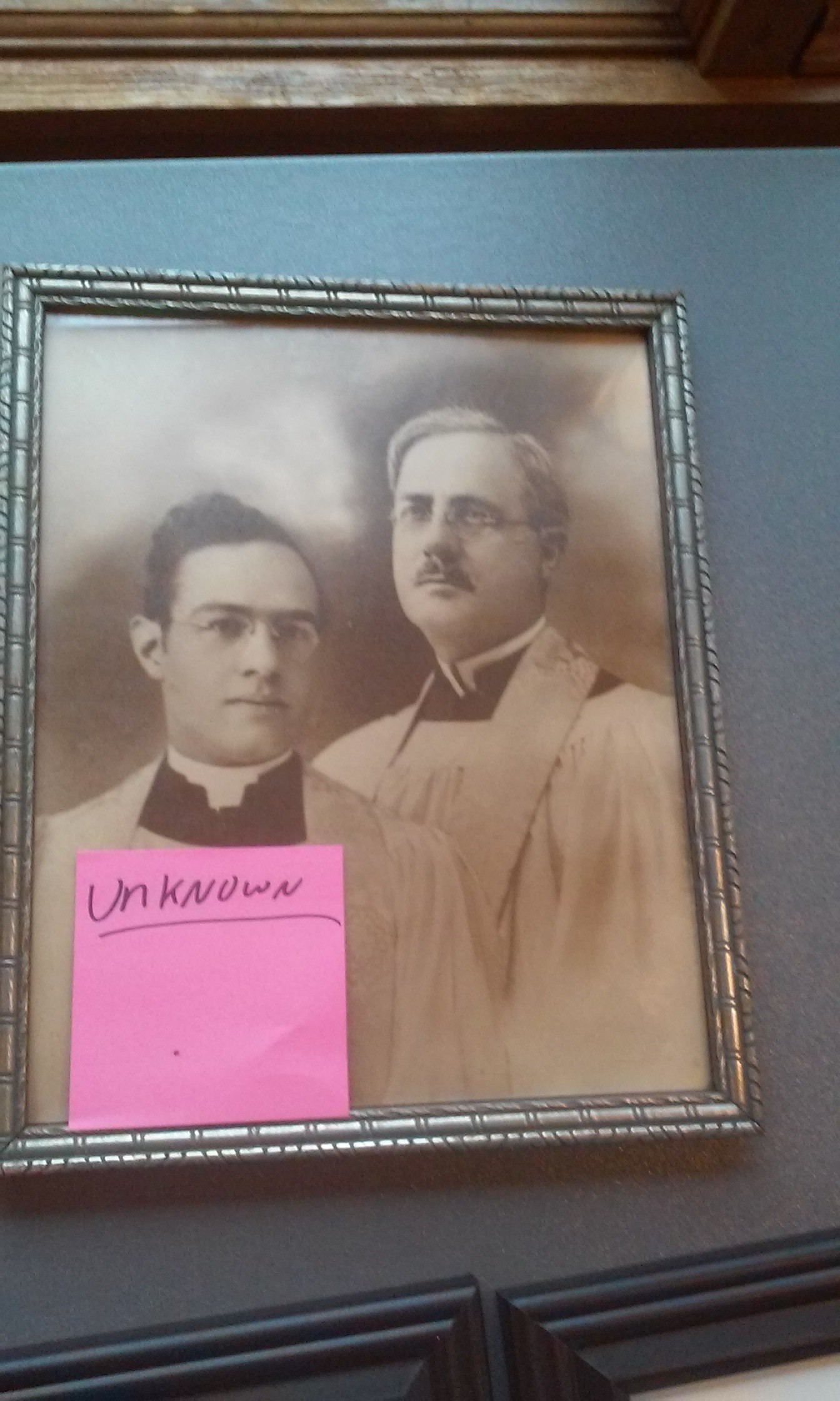 Due to a generous donation from a parishioner, I now have a part time Administrative Assistant at Emmanuel, so Fr. Kenny and I are free to do other things. One thing that we have wanted to do for a long time is to make what I affectionately call “a rogues’ gallery.” This is an area in a church where you hang pictures of all the past priests. Now, Emmanuel has had a lot of priests since 1862, so I could only find 11 identifiable pictures.