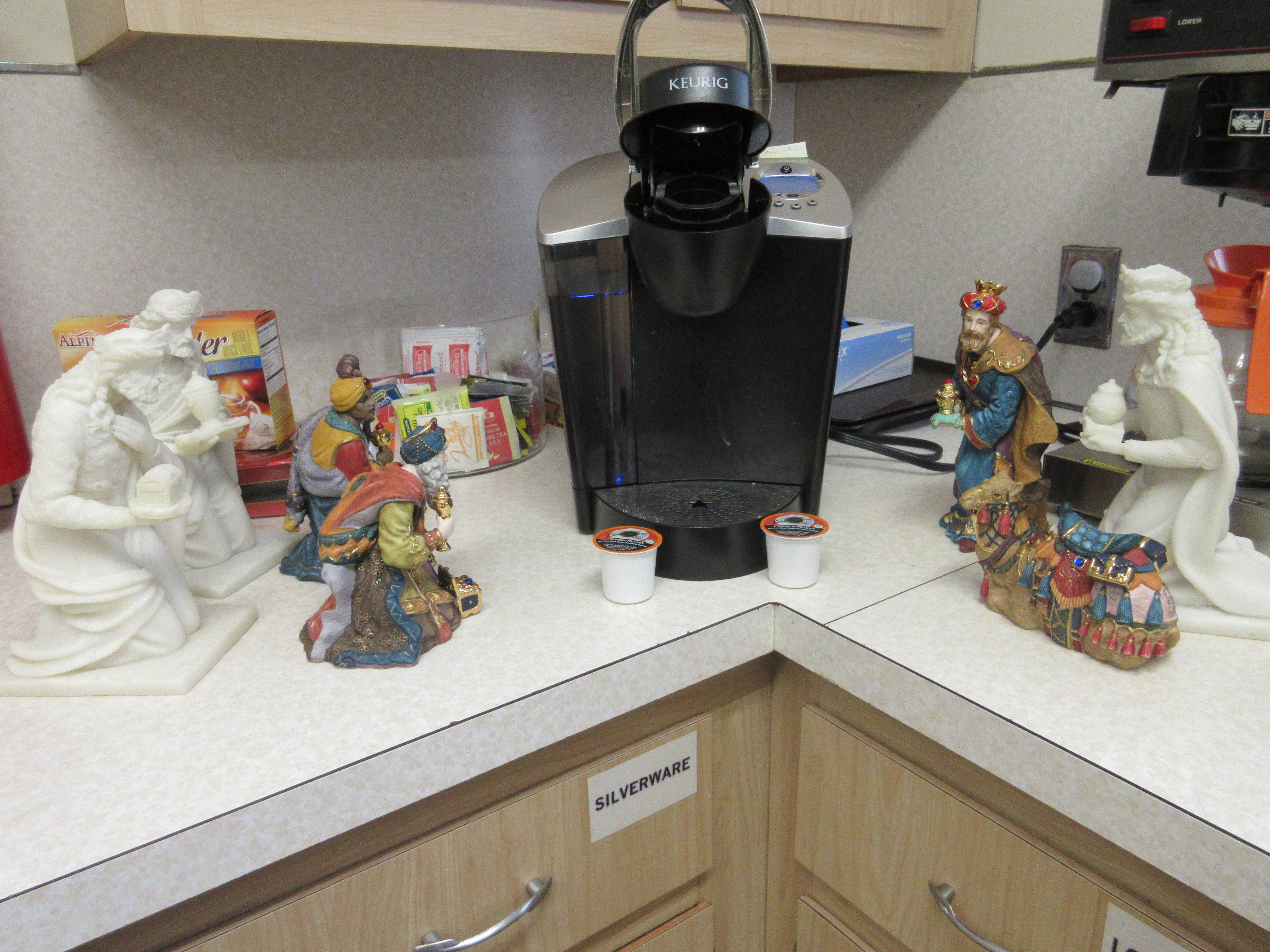 A pit stop at the Oasis, i.e. the Keurig. While Fr. Kenny gave them pods for the machine, he neglected to teach the ancient travelers how to use it.